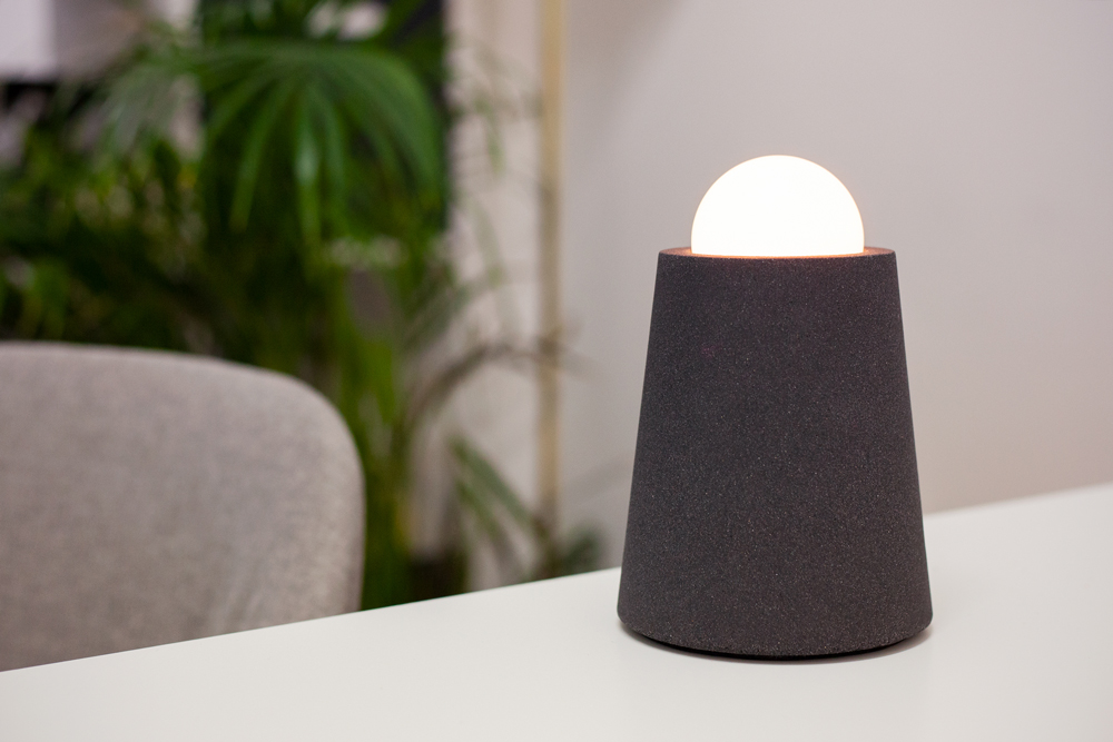 A subtle and contemporary tabletop lamp that features an exposed LED lightbulb which you twist directly to activate and dim. The product has a simple construction, comprised of a cast conical body in a textured charcoal finish, sat below a sunken standard LED lightbulb which screws directly into the base. The user simply rotates the lightbulb clockwise to activate the bulb and to gently increase its brightness in one smooth motion. The lighting assembly sits on a potentiometer built directly into the circuit board to provide the function in a cohesive and easy to manufacture unit.