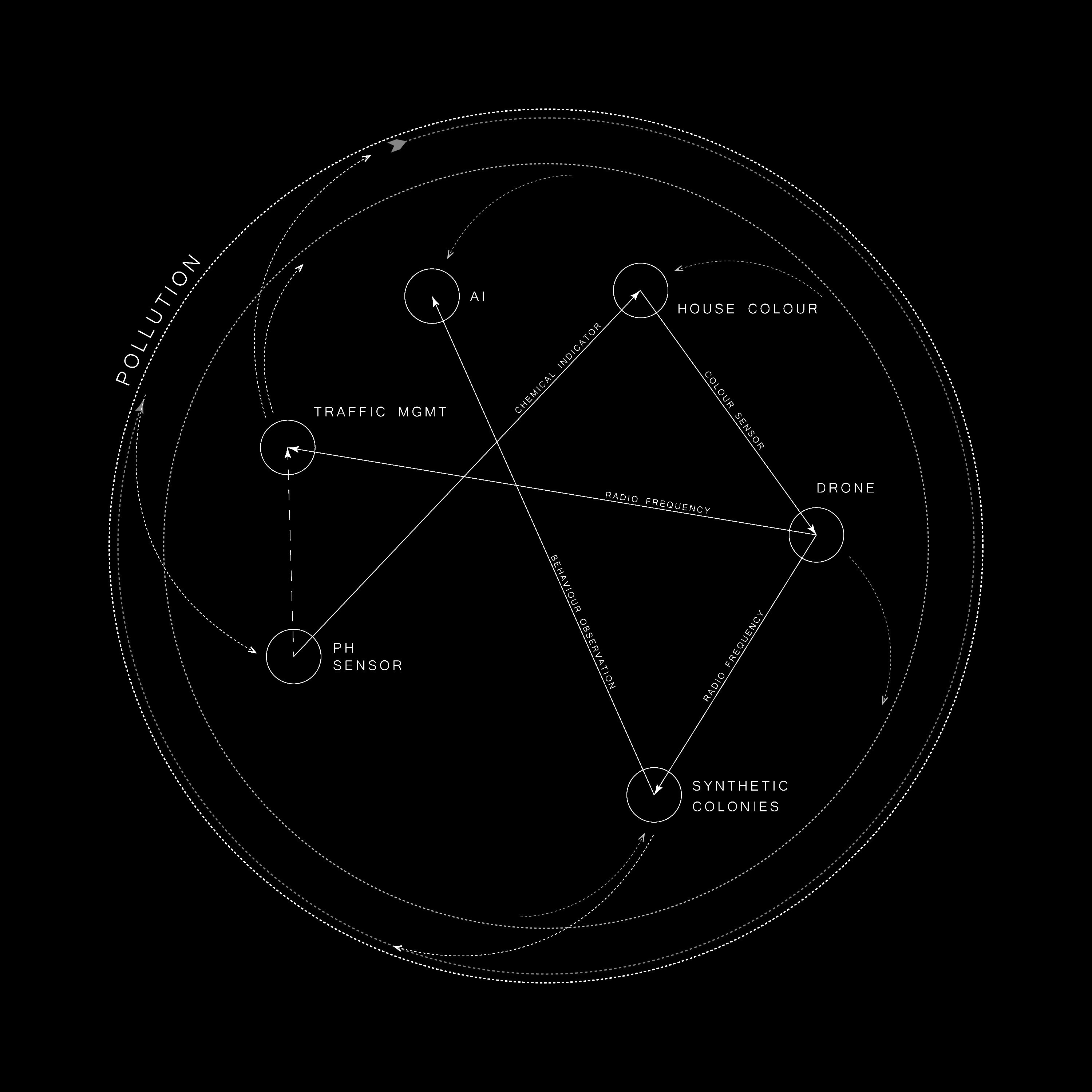 This project proposes an adjustment to our relationship with connected technology, into a dialogue between urban humans and non-biological citizens, whose behaviour, and our interpretation of it, can aid our understanding of the city. We challenge the notion of passive, connected street furniture, to reframe smart devices as machine organisms who live autonomously in the same spaces that we do. More similar to an urban fox than your iPhone. Revealing the subterranean and centralised infrastructure in our cities fragments data exchange into various woven nodes that provide the freedom for citizens to engage and observe more regularly and with a greater sense of tactility, readability and intuition. As if watching sitting cows in a field to tell if it will rain. Pollution is an ecological problem for city dwellers globally. People rightfully demand clean air in their neighbourhoods. Governments try to keep track of the issue as best they can, often using closed loops and black box technology. We have visualised an example of our concept with a working prototype of a machine we call “The Forager”. It changes colour based on PH sensitive markers placed around the city that detect air pollution. It sits within a broader network of connected nodes that scale from a community to national level.